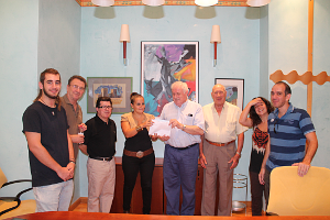 Representantes del Banco de Alimentos, los concejales de cultura y asuntos sociales del Ayuntamiento de Salobreña, Antonio Rabaneda y MªJosé García, y los artistas participantes se han reunido hoy para hacer balance de la exposición solidaria “Garabatos digitales” realizada el pasado mes de agosto en la Bóveda del Casco histórico de la Villa.