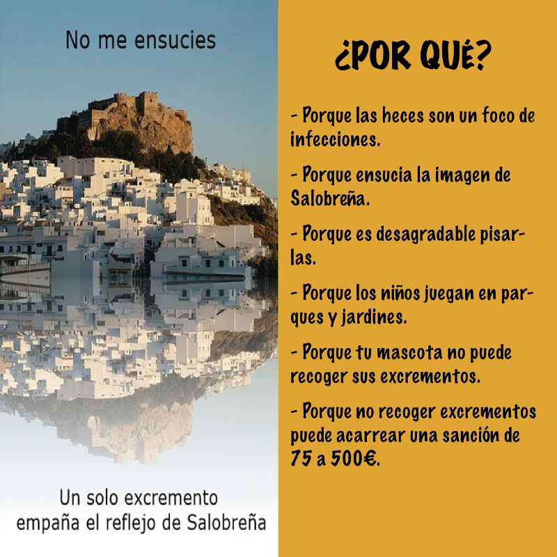 “Concienciar a los vecinos del municipio sobre la importancia de la retirada de los excrementos de sus mascotas de las calles y parques de Salobreña es el principal objetivo de esta segunda fase ya que, y según explicaba el concejal de medio ambiente, Martín Valenzuela, además de causar un problema evidente de imagen, afecta a la salud de los vecinos, ya que abandonar los excrementos de nuestras mascotas crea focos de transmisión de enfermedades infecciosas que pueden afectar a las personas. Además también pueden provocar daños físicos debido a posibles resbalones y caídas.”