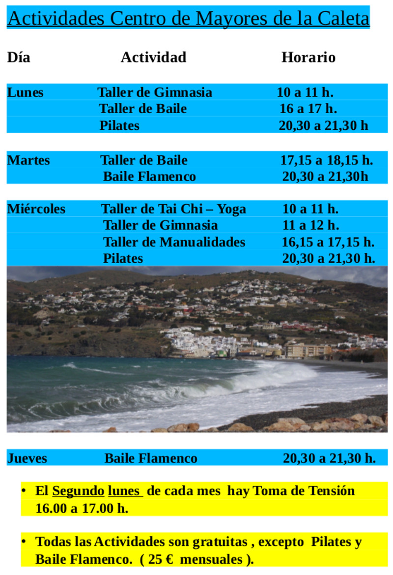 Se detallan los horarios de todas las actividades y talleres previstos para 2015-16 en La Caleta.
