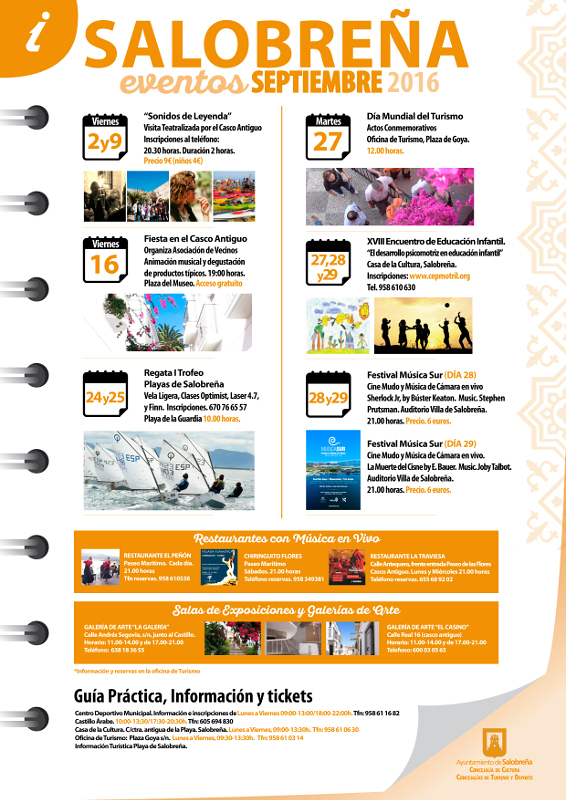 Las Concejalías de Cultura, Turismo y Deportes informan de los eventos programados para el mes de septiembre de 2016.