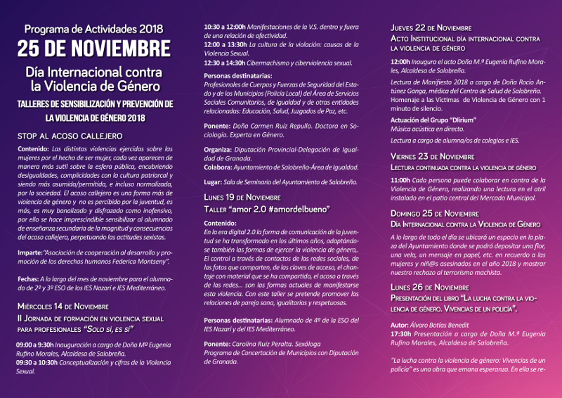Las actividades previstas finalizarán con la presentación del libro “La lucha contra la violencia de género. Vivencias de un policía” el lunes 26 de noviembre y la Conferencia “Protocolo de agresiones sexuales y sumisión química” a cargo de Carmen Aguera Urbano, médica del Hospital Costa del Sol de Marbella, y destinado a toda la población.