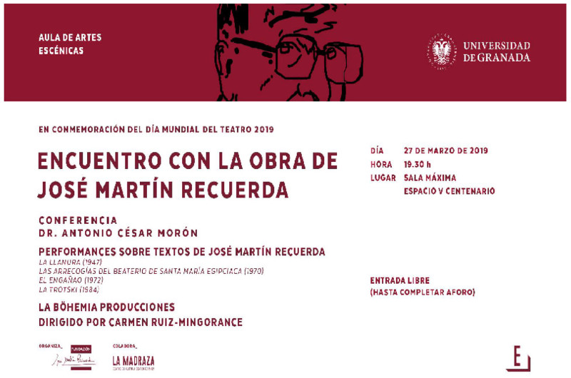 La Fundación que lleva el nombre del dramaturgo granadino y la Universidad de Granada -Patrono institucional de la Fundación- han decidido conmemorar el Día Mundial del Teatro 2019 con un “Encuentro con la obra dramática de José Martín Recuerda”.