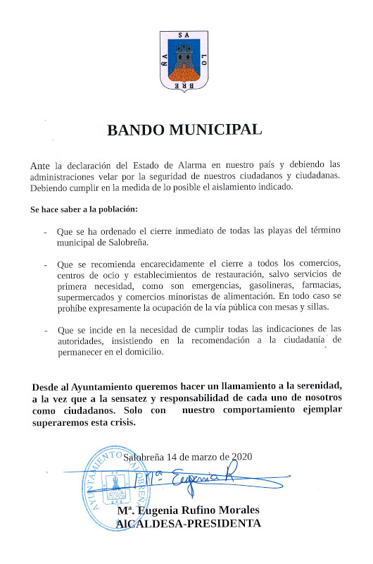 - Que he ordenado el cierre inmediato de todas las playas del término municipal de Salobreña.