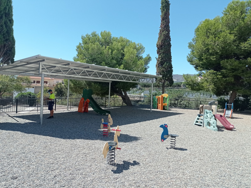 La construcción de la misma ha corrido a cargo de operarios municipales, se ha construido con materiales de primera calidad y ofrece a los pequeños una estancia en la que en invierno les da un poco de calor y en verano rebaja la temperatura, no sólo con la sombra si no, también por el material empleado que hace descender la temperatura del interior de la misma.