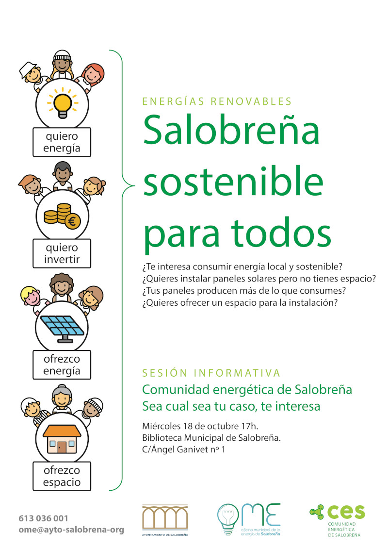 El próximo miércoles 18 de octubre a las 17h, en la Biblioteca tendrá lugar una “Jornada informativa sobre la comunidad energética de Salobreña” a cargo de la OME (Oficina Municipal de la Energía) además de representantes municipales para establecer una hoja de ruta y poder así materializar el proyecto.