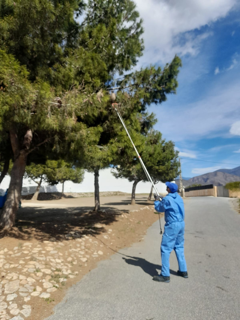 Por ello el área de Parques y jardines del Ayuntamiento de Salobreña ha activado un plan especial para intentar su control y atajar el problema en la medida de lo posible. Así la empresa “Sanisur” está llevando a cabo una desinfección del principal foco de esta plaga, que se encuentran en los pinos, donde la procesionaria tiene los nidos. Se procederá al corte y quemado de los mismos, además de inyectar un insecticida en los árboles que evite una nueva propagación.