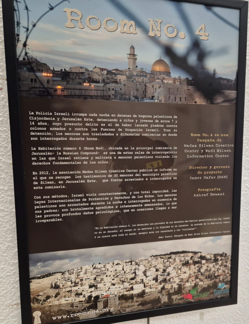La exposición, concedida dentro del Programa de Concertación de la Diputación Provincial con el área de Bienestar Social, en el apartado de cooperación internacional, incluye 13 imágenes que muestran la realidad de los menores cuando son detenidos por la policía israelí, siendo los artistas y personalidades de la cultura palestina los protagonistas de las instantáneas según los testimonios de niños y jóvenes de Jerusalén Este.