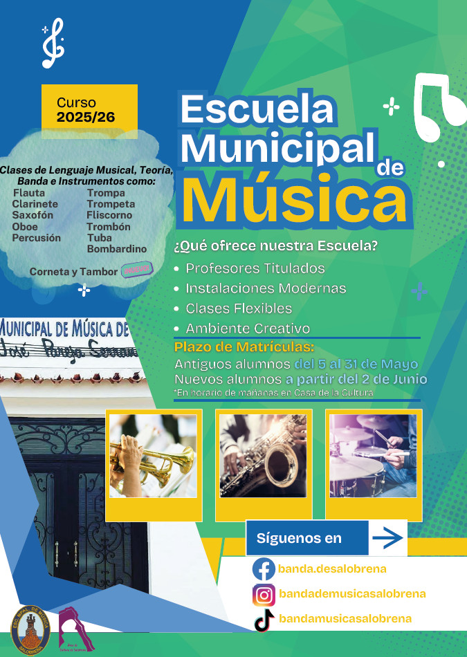 Se ofertan clases de Teoría y Lenguaje Musical, clases de instrumentos de viento madera (flauta, oboe, clarinete y saxofón), viento metal (trompeta, fliscorno, trombón, bombardino y tuba), y percusión. También clases de apoyo para Conservatorio y preparación para acceso al mismo. Además, este año como novedad se incluyen las especialidades instrumentales de corneta y tambor.