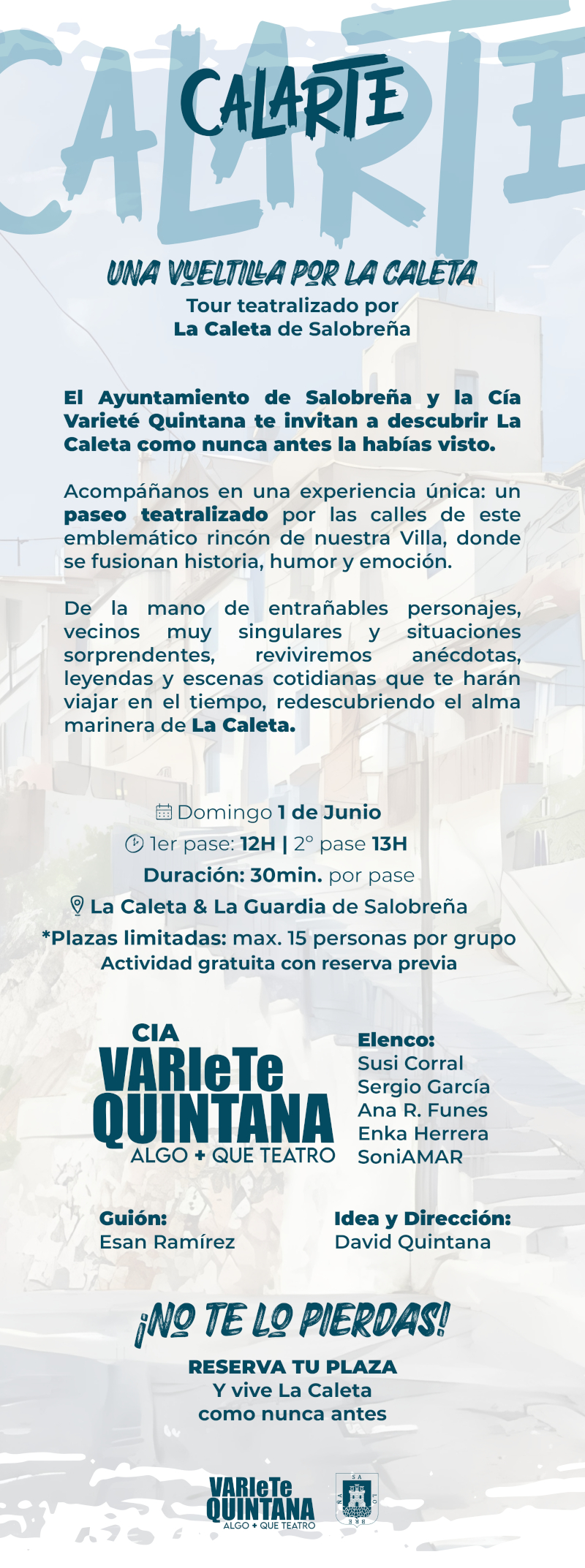 La propuesta gratuita de realizar un tour teatralizado por La Caleta permitirá descubrir este rincón de una forma diferente, fusionando historia, humor y emoción. De la mano de entrañables personajes, vecinos muy singulares y situaciones sorprendentes, se contarán anécdotas, leyendas y se vivirán escenas cotidianas que harán a los participantes viajar en el tiempo, redescubriendo el alma marinera de La Caleta.