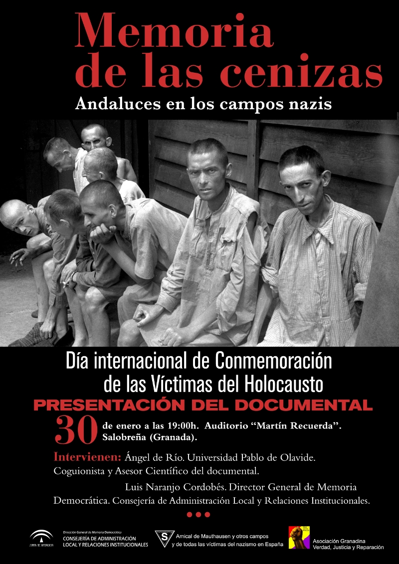 El área de Cultura del Ayuntamiento de Salobreña acogerá algunos de los actos que organiza la dirección General de la Memoria Democrática en conmemoración de efemérides como el día del Holocausto o la Desbandá. En concreto mañana jueves día 30, a las siete de la tarde, en el Auditorio de la Villa tendrá lugar un acto que contará con la presencia del propio Director General de la Memoria Democrática de la Junta de Andalucía, Luis Naranjo. Se trata de una conferencia-proyección a cargo del profesor Universitario Ángel del Río y el estreno del documental “Memoria de las Cenizas”, con motivo de la Conmemoración del Día Internacional de las Víctimas del Holocausto. Este documental versa sobre andaluces en los campos nazis.