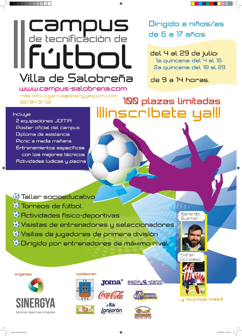 Sinergya Sport, en colaboración con el Ayuntamiento de Salobreña, pone en marcha el II Campus de Tecnificación de Fútbol “Villa de Salobreña” que se celebrará del 4 al 29 de julio en el complejo deportivo Julio Martín y en el que destaca la participación de Lucas Alcaraz, ex entrenador del Granada CF y UD Levante de Primera División.