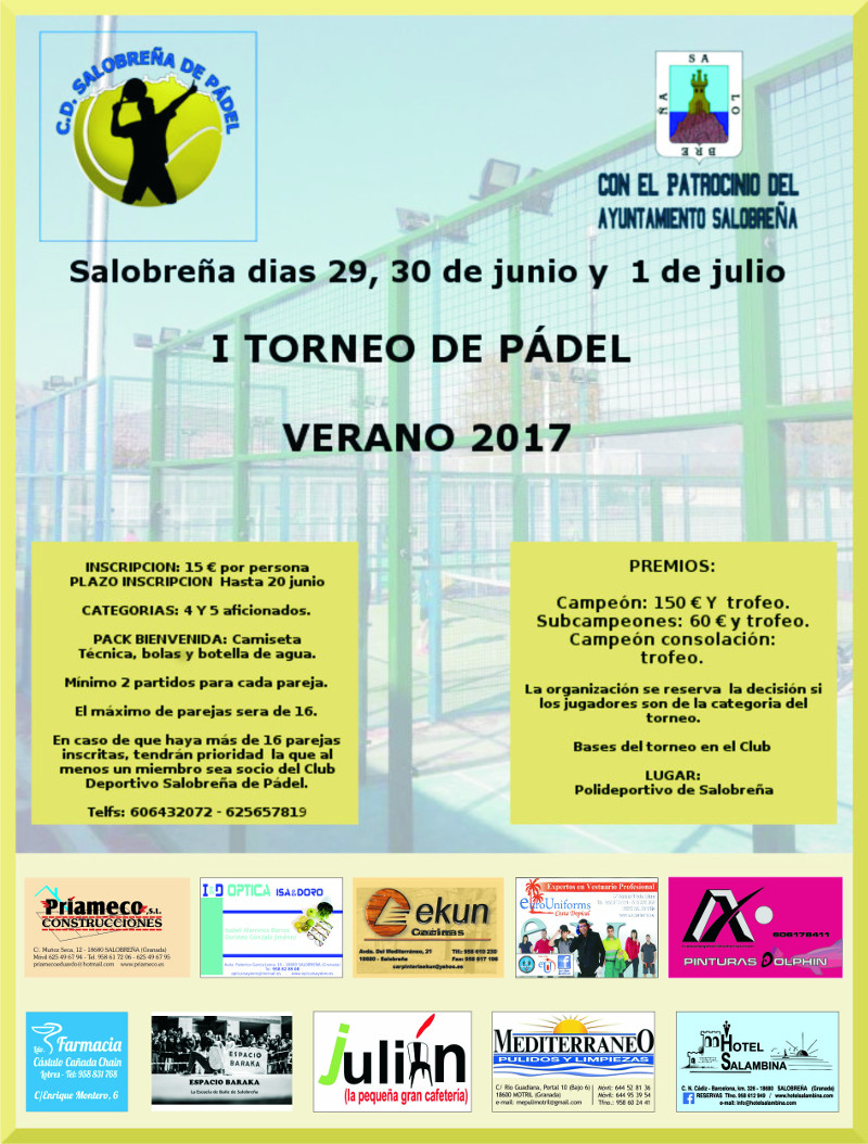 Tras la creación del Club deportivo Salobreña Pádel, la Villa acoge el I Torneo de Pádel que se celebrará los días 29 y 30 de junio, y 1 de julio en las pistas situadas en el Polideportivo municipal. Un nuevo club cuyo nacimiento aplaude el concejal de turismo, Manuel Guirado, ya que se aprovecharán aún más unas instalaciones hasta ahora infrautilizadas.