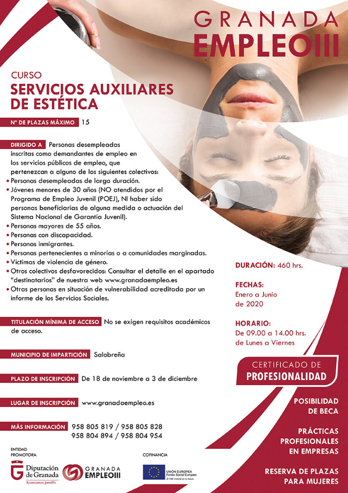 Salobreña participa una vez más en el proyecto promovido por la Diputación de Granada “Granadaempleo”. En esta tercera edición, a la Villa le ha correspondido uno de los itinerarios de inserción programados denominado “Curso de servicios auxiliares de estética”y dirigido a personas pertenecientes a los colectivos más afectados por el desempleo y la precariedad sociolaboral.