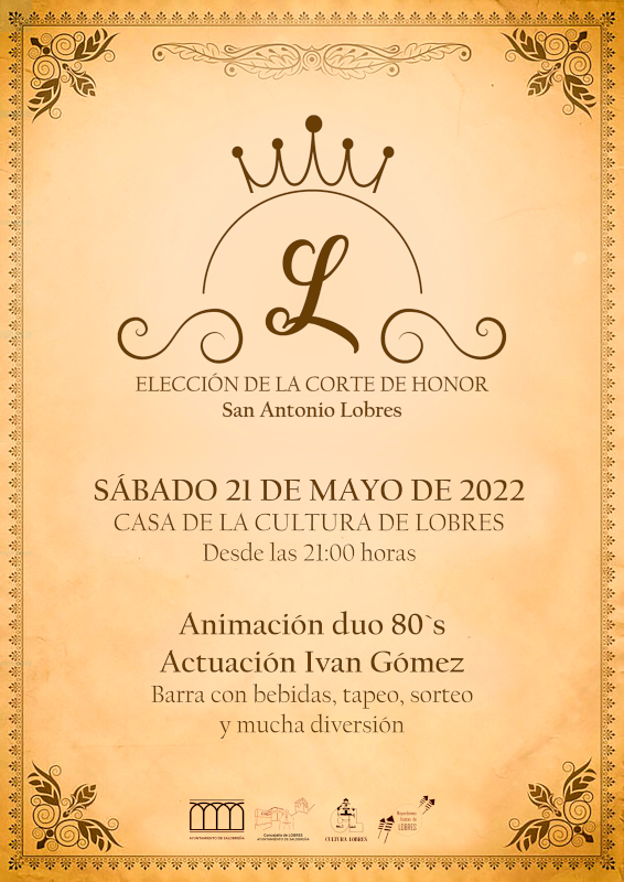 Con motivo de las Fiestas Patronales de Lobres en honor a San Antonio, este año se volverá a celebrar con normalidad la elección de la Corte de Honor. El nombramiento se hará público en una gran fiesta juvenil, que tendrá lugar el próximo sábado 21 de mayo en el recinto de la Casa de la Cultura, y que estará amenizada por el Dúo 80`s contando además con la actuación de Iván Gómez. También habrá una barra gestionada por el grupo de Mayordomos de Lobres.