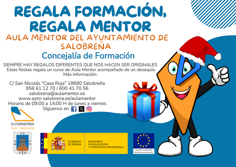 Con motivo de la llegada de la Navidad, desde el área de Formación y Empleo del Ayuntamiento de Salobreña, a través del Aula Mentor, se vuelve a poner en marcha la la campaña “Regala Formación, Regala Mentor” con la que es posible obsequiar a un ser querido mediante un cheque-regalo que se podrá canjear por cualquiera de los cursos que se ofertan en el marco del Aula Mentor.