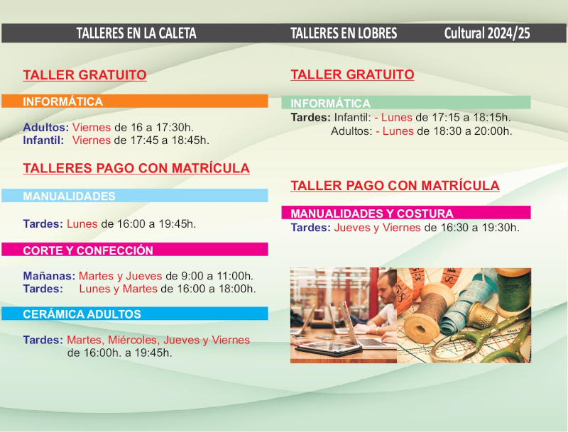 En La Caleta se oferta un taller de Zumba, además de los clásicos de Cerámica, Informática, Manualidades o Corte y Confección. En el anejo de Lobres se han programado los Cursos de Informática y Nuevas Tecnologías, además de Manualidades y Costura.