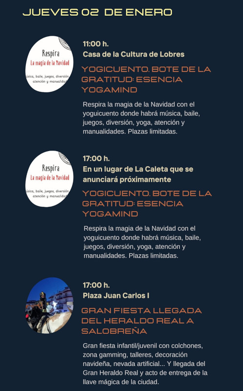 El Heraldo, que llegará a caballo acompañado de un séquito de la Asociación de Caballistas de Salobreña, tiene la importante misión de recoger la llave mágica de Salobreña. Esta ceremonia se llevará a cabo en un ambiente festivo donde los más pequeños tendrán también la oportunidad de entregarle personalmente sus cartas. Para ello la plaza se transformará en un espacio lleno de entretenimiento para toda la familia. Los asistentes podrán disfrutar de una variedad de actividades, incluyendo hinchables y talleres creativos, así como una zona gaming.La decoración festiva y la presencia de personajes mágicos harán que el ambiente brille aún más, complementado por una nevada artificial.